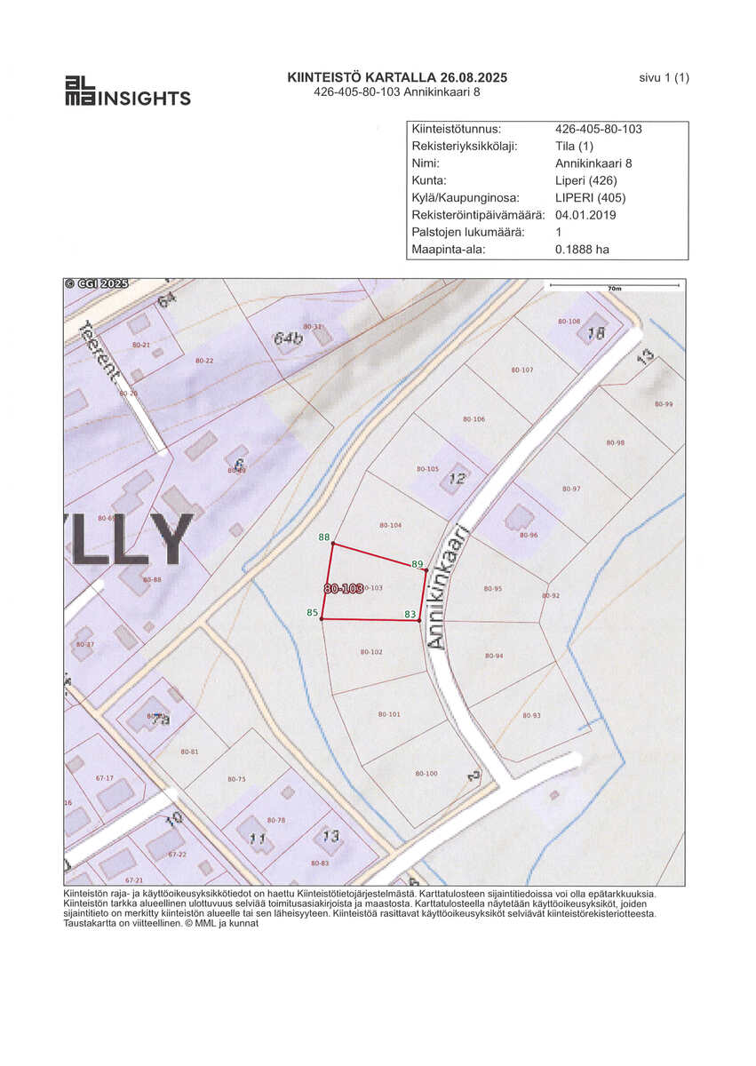 AP= pientalovaltainen asuntoalue. Rakentamaton omakotitalotontti, tehokkuusluku 0,20 (377,60 k-m2). Maaperä, rakennettavuus luokka 1. Vesi- ja viemärin liitäntäpiste on tontin rajalla eteläkulmassa.