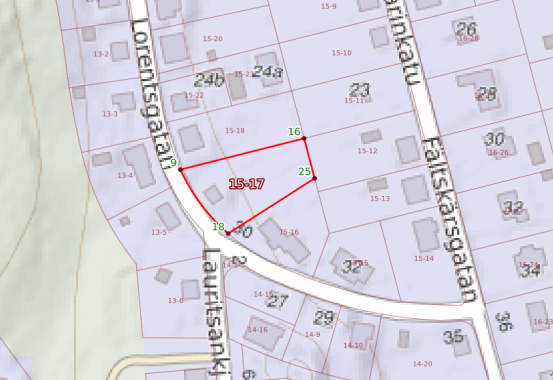 | Kaavoitustiedot | 1-kerroksisen vähintään PL. 4 § D-luokan I-ryhmän, enintään kaksi huoneistoa käsittävän omakotirakennuksen rakennusala. Rakennuksen pinta-ala saa olla enintään 120 m2 ja korkeus julkisivupinnan ylärajaan enintään 5.5 m. Ullakosta saa sisustaa 3/5. Katonkaltevuuden tulee olla 30 astetta ja katonharjan rakennusalaan merkityn keskiviivan suuntainen. Rakennus on sijoitettava kadunpuoleiseen rakennusrajaan. PL. 4 § D-luokan II-ryhmän talousrakennuksen rakennusala. Korkeus julkisivupinnan ylärajaan saa olla enintään 3.5 m. Katon tulee olla harjakatto ja katonkaltevuuden 30 astetta. |