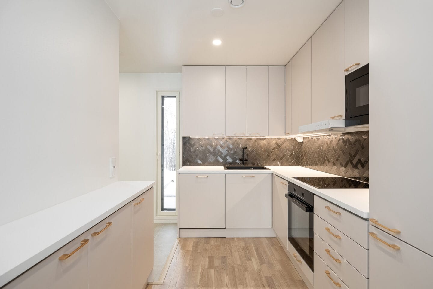 Liesi (erillisuuni, liesitaso), työtasot (laminaatti), seinät (maali), jääkaappipakastin, erillisuuni, mikroaaltouuni, liesituuletin, astianpesukone ja kiinteät valaisimet, liesitaso, Integroidut kodinkoneet, vinyylilankkulattia |