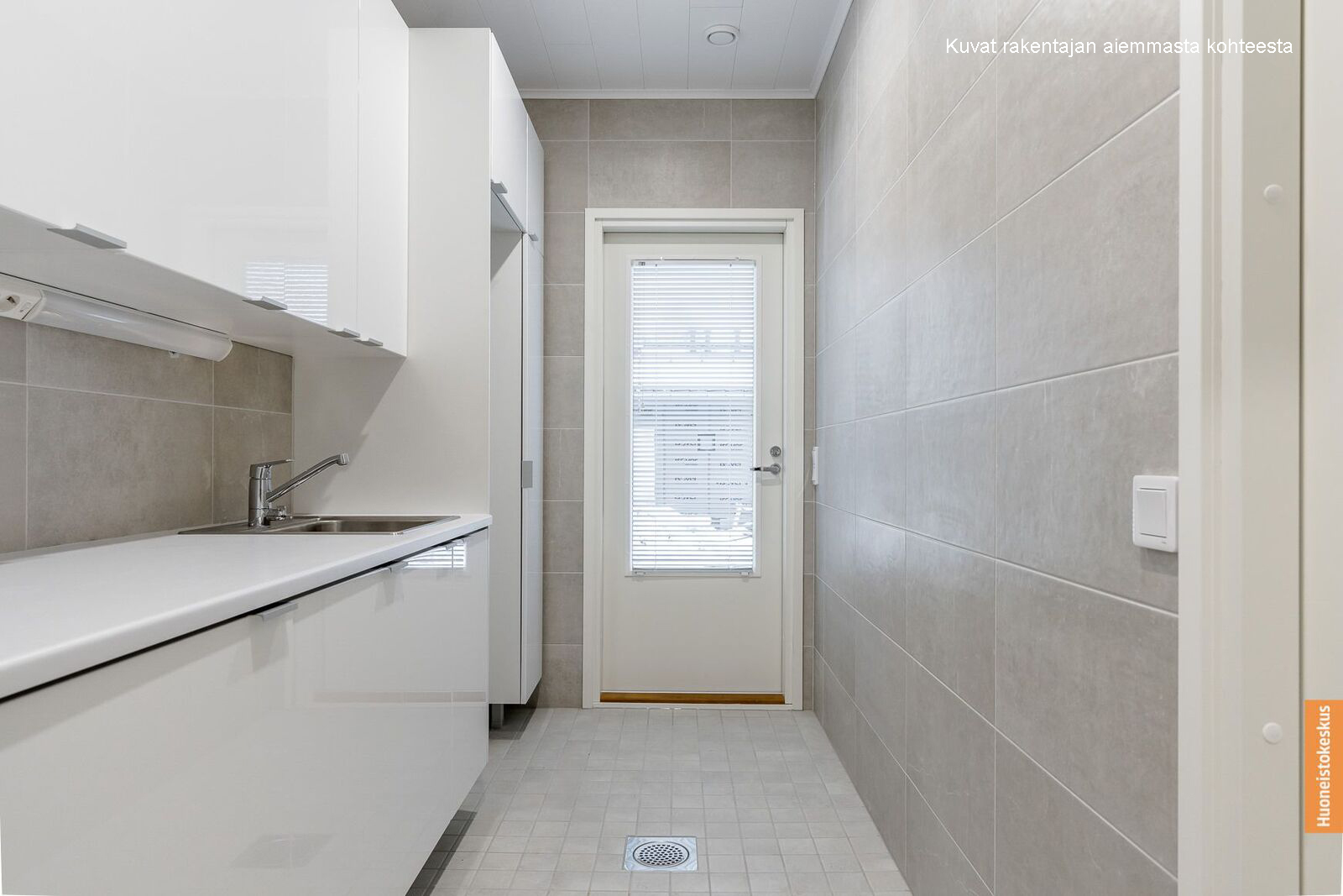| Kodinhoitohuoneen kuvaus | Kalusteet, taso laminaattia, teräsallas, liitäntä pesukoneelle. Ilmanvaihtokone. Lattia laattaa ja seinät kaakelia. Kodinhoitohuoneesta käynti terassille. |