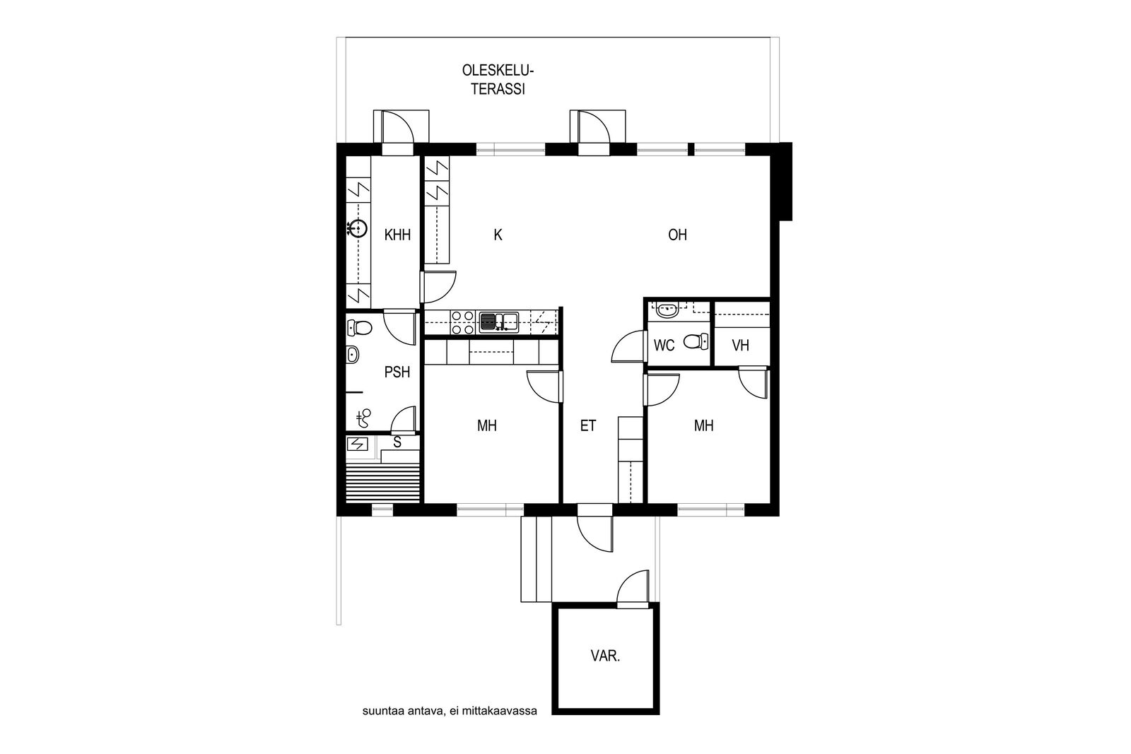 Arkea helpottaa erillinen kodinhoitohuone, josta käynti myös ulos terassille. Kaksi wc:tä, toinen erillinen wc ja toinen kylpyhuoneessa. Kylpyhuoneen yhteydessä on oma sauna.