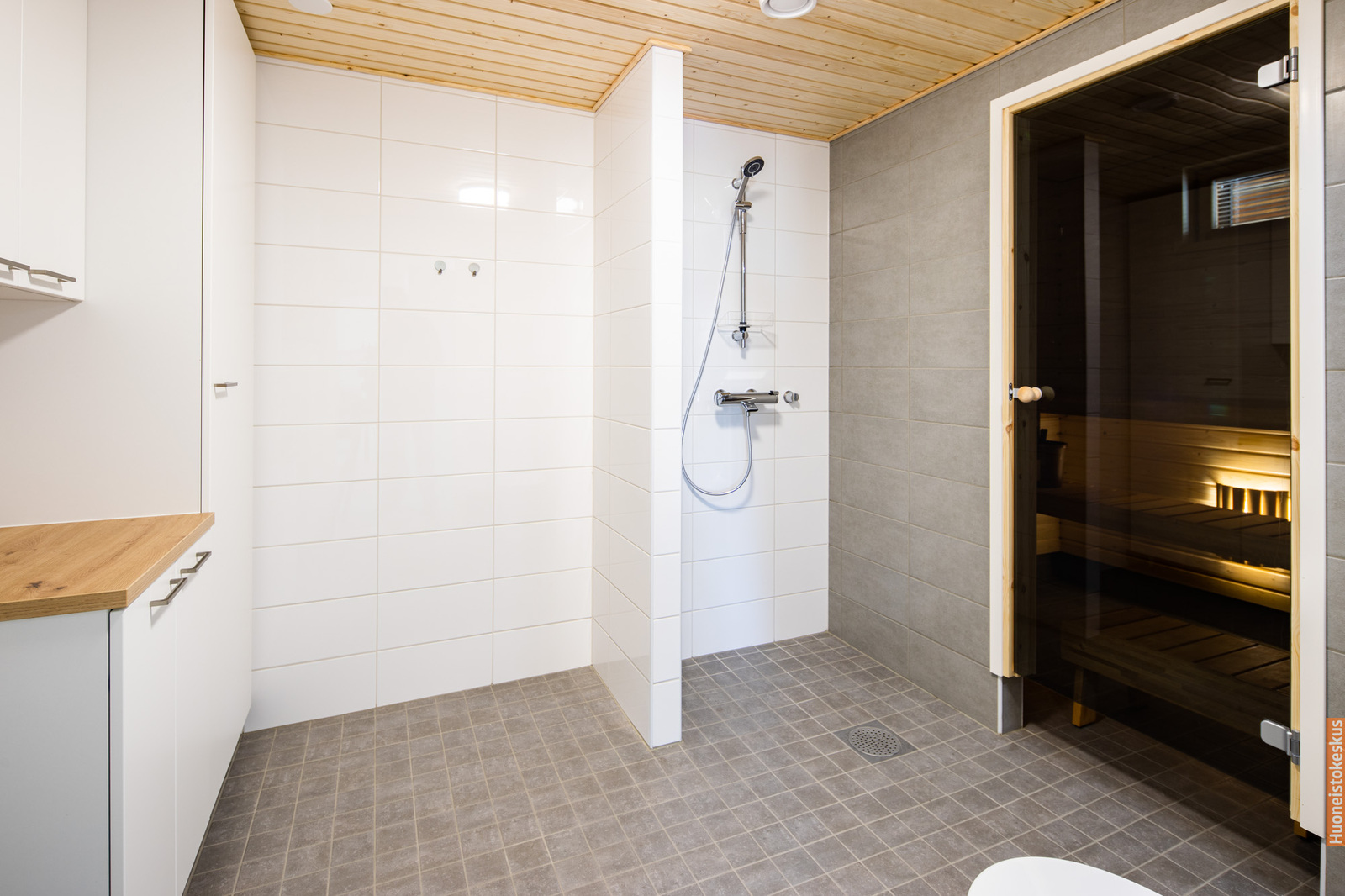 | Kylpyhuoneen kuvaus | Suihku, wc-istuin, peili, lattialämmitys, pesukoneliitäntä, suihkuseinä, allaskaappi ja kiinteät valaisimet, seinät (kaakeli), lattiat (laatta) |