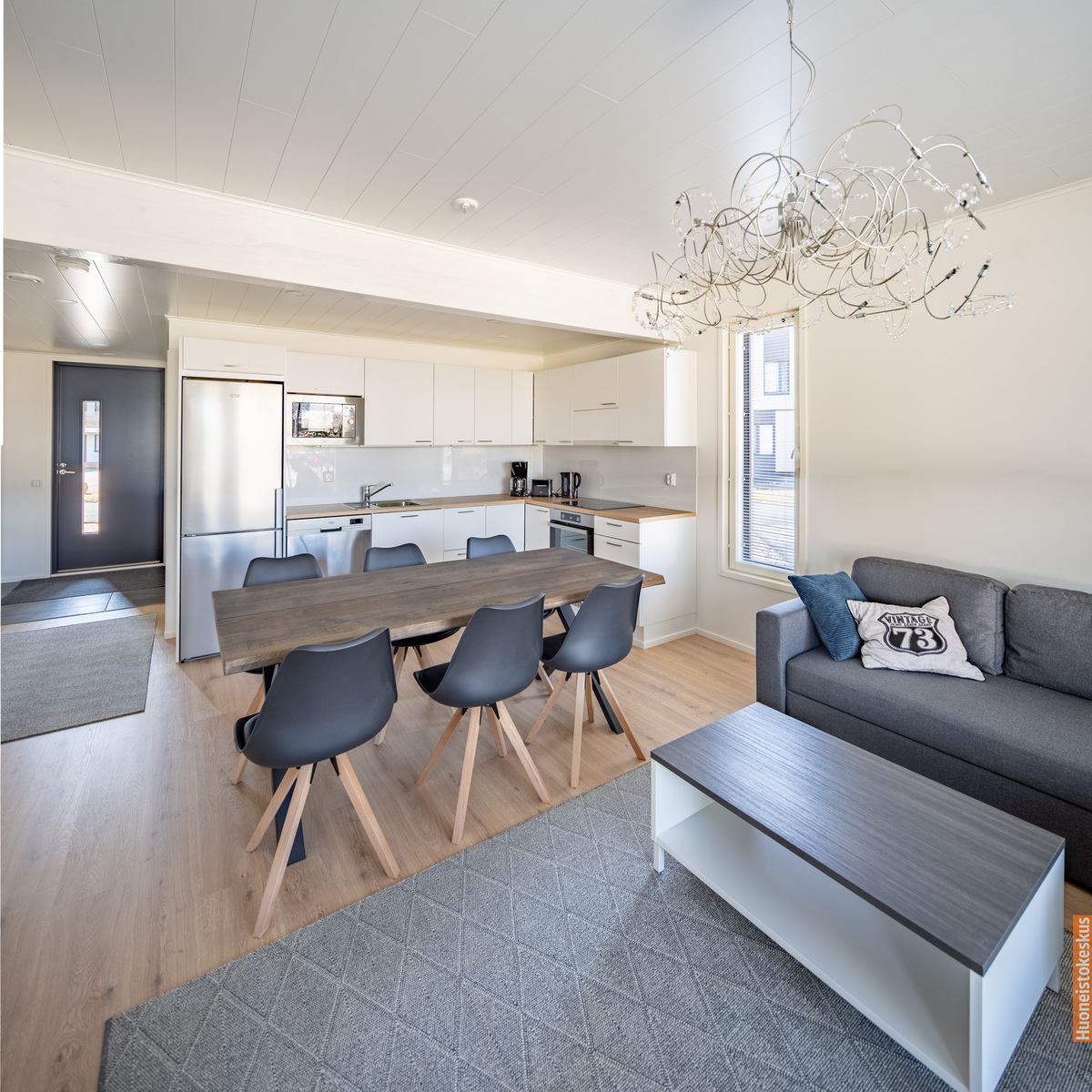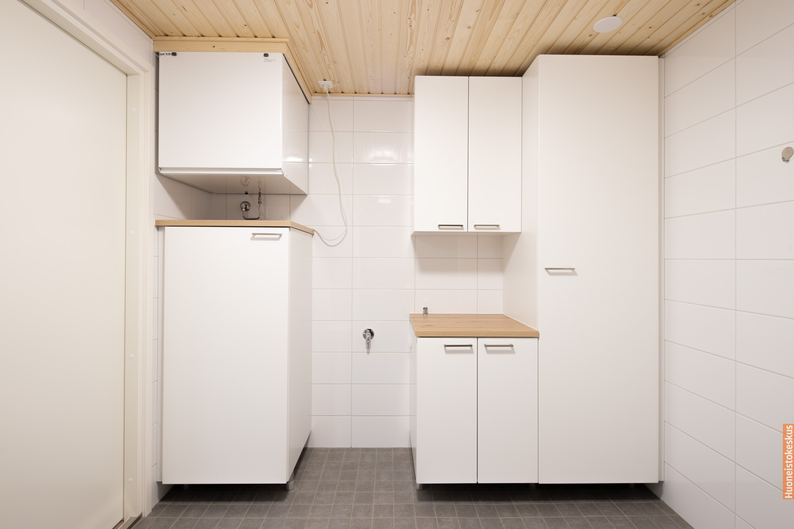 | Keittiön kuvaus | Liesi (Induktioliesi ja erillisuuni), työtasot (laminaatti), seinät (maali), lattiat (vinyyli), erillisuuni, liesi, astianpesukone ja jääkaappipakastin |