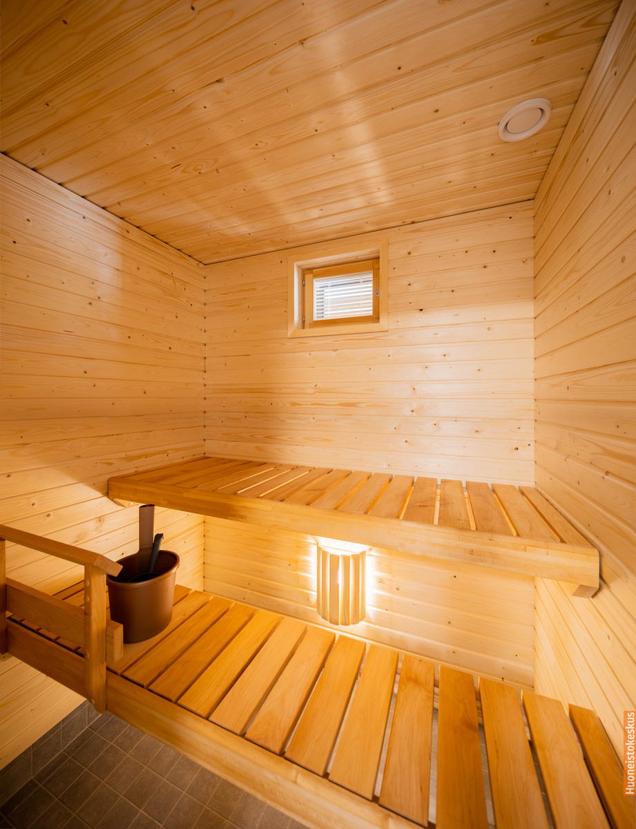 | Saunan kuvaus | Seinät (puu), lattiat (laatta), Sähkökiuas |