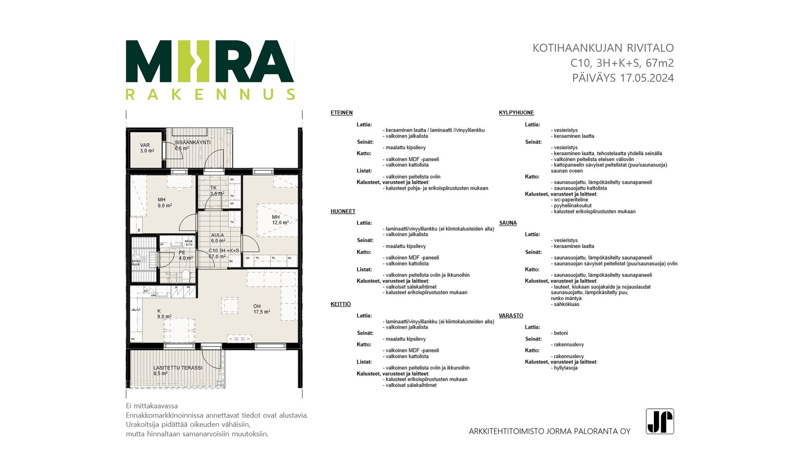 | Kattomateriaalin kuvaus | Saunassa ja kylpyhuoneessa lämpökäsitelty tervaleppäpaneeli, muissa tiloissa mdf-paneeli tai maalattu kipsilevykatto. |