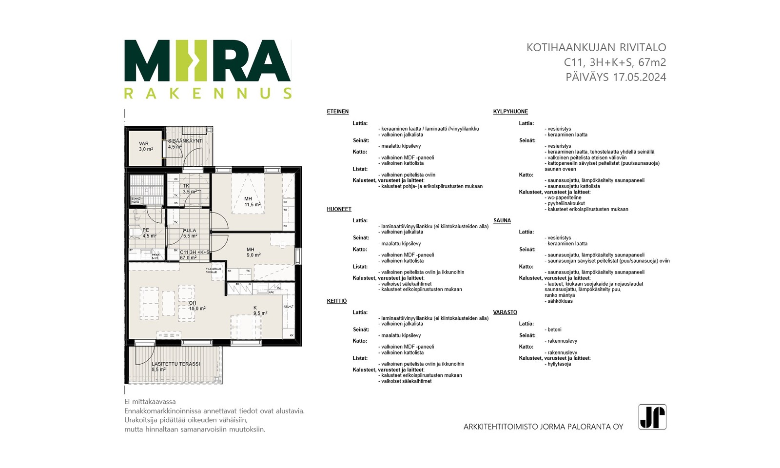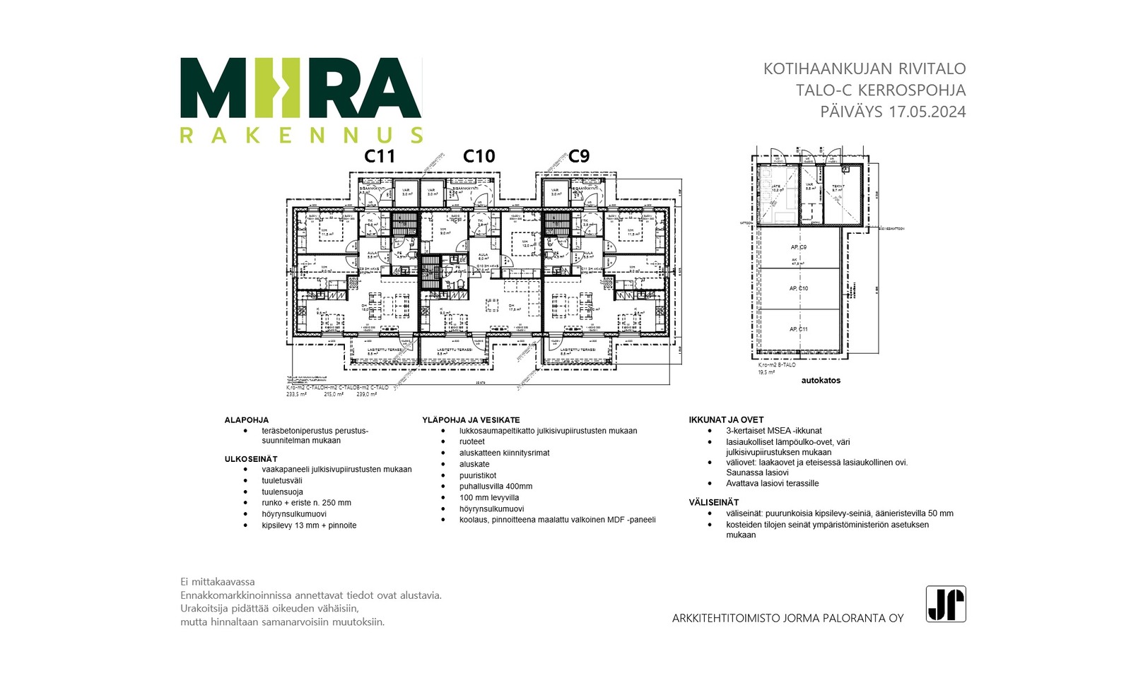 | Kattomateriaalin kuvaus | Saunassa ja kylpyhuoneessa lämpökäsitelty tervaleppäpaneeli, muissa tiloissa mdf-paneeli tai maalattu kipsilevykatto. |