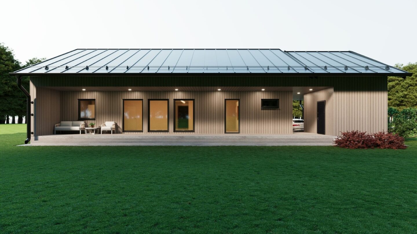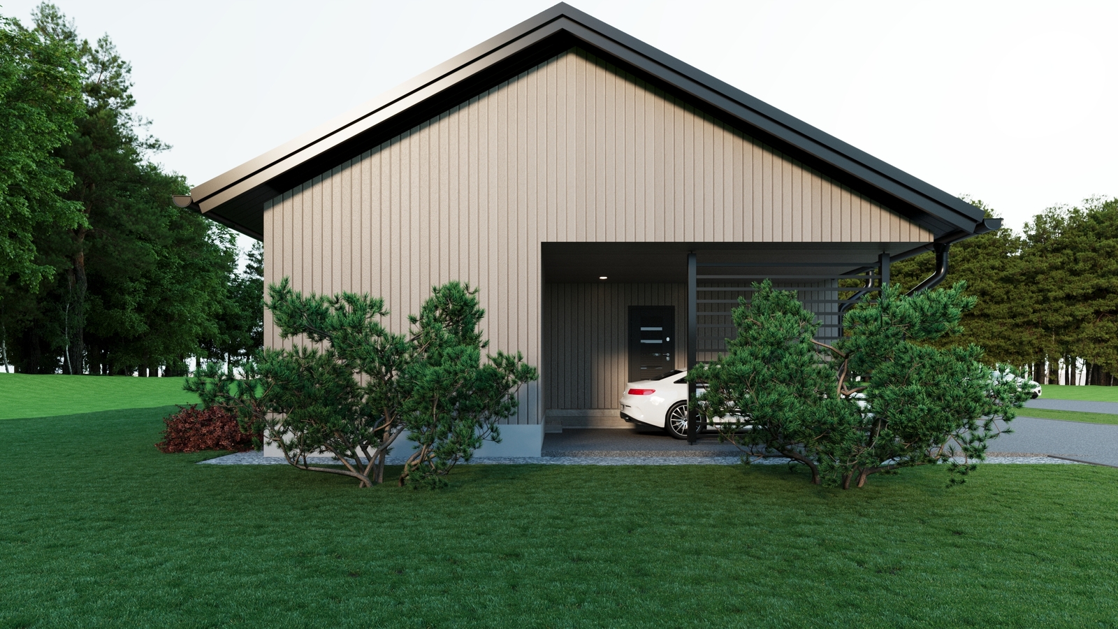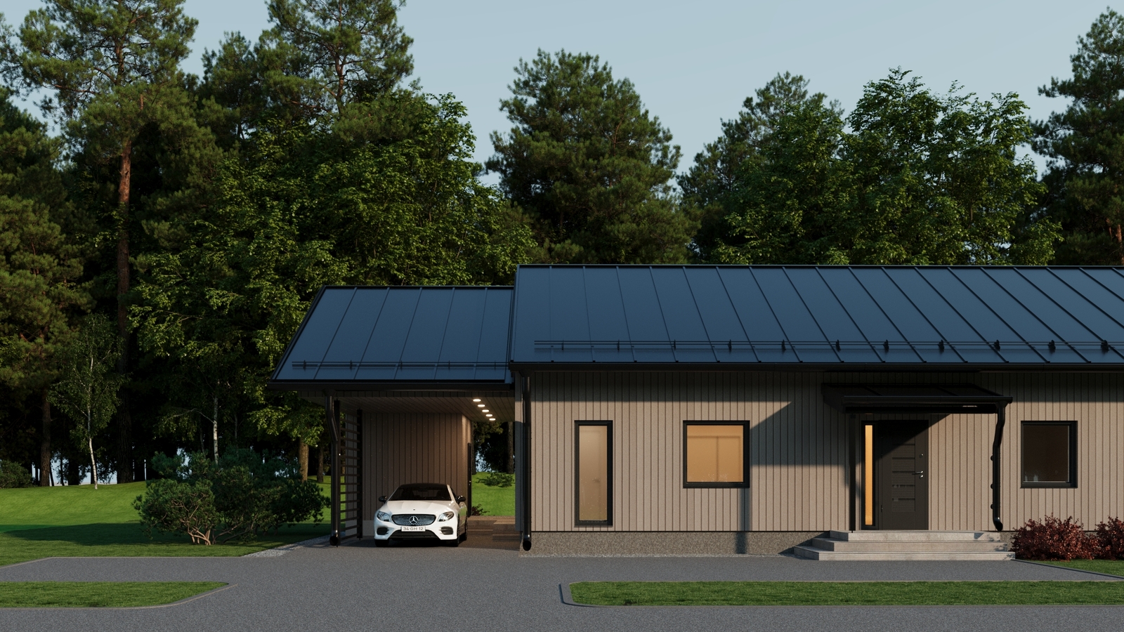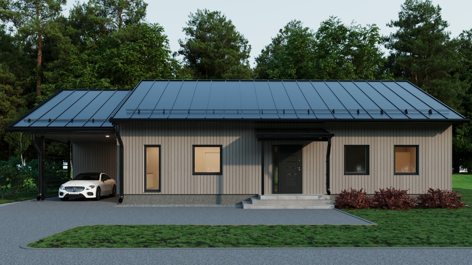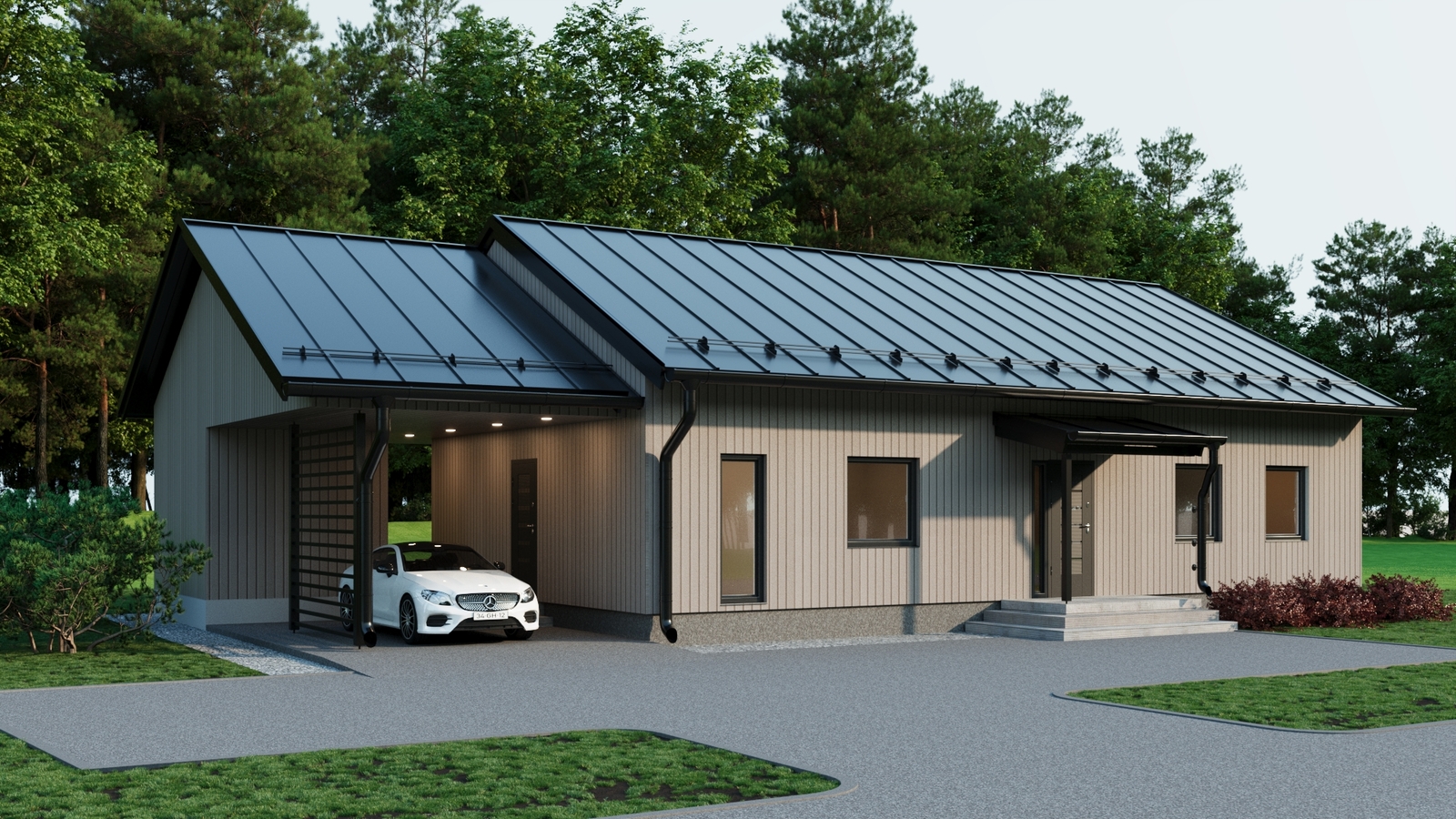 Loistava vaihtoehto valmista kohdetta etsivälle tai rakentamista suunnittelevalle perheelle. Tyylikäs harjakattoinen julkisivu, johon pystylaudoitus ja suuret ikkunapinnat mustilla ulkopuitteilla tuovat modernin ilmeen. Talon levyinen katettu terassi, autokatos ja lämmin varasto sulautuvat hienosti kokonaisuuteen.