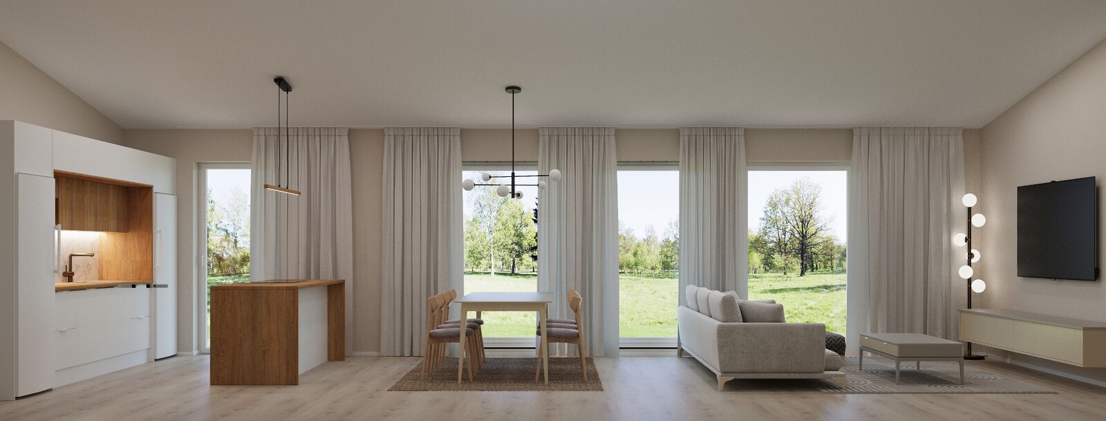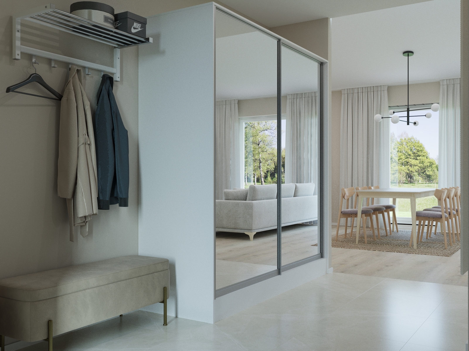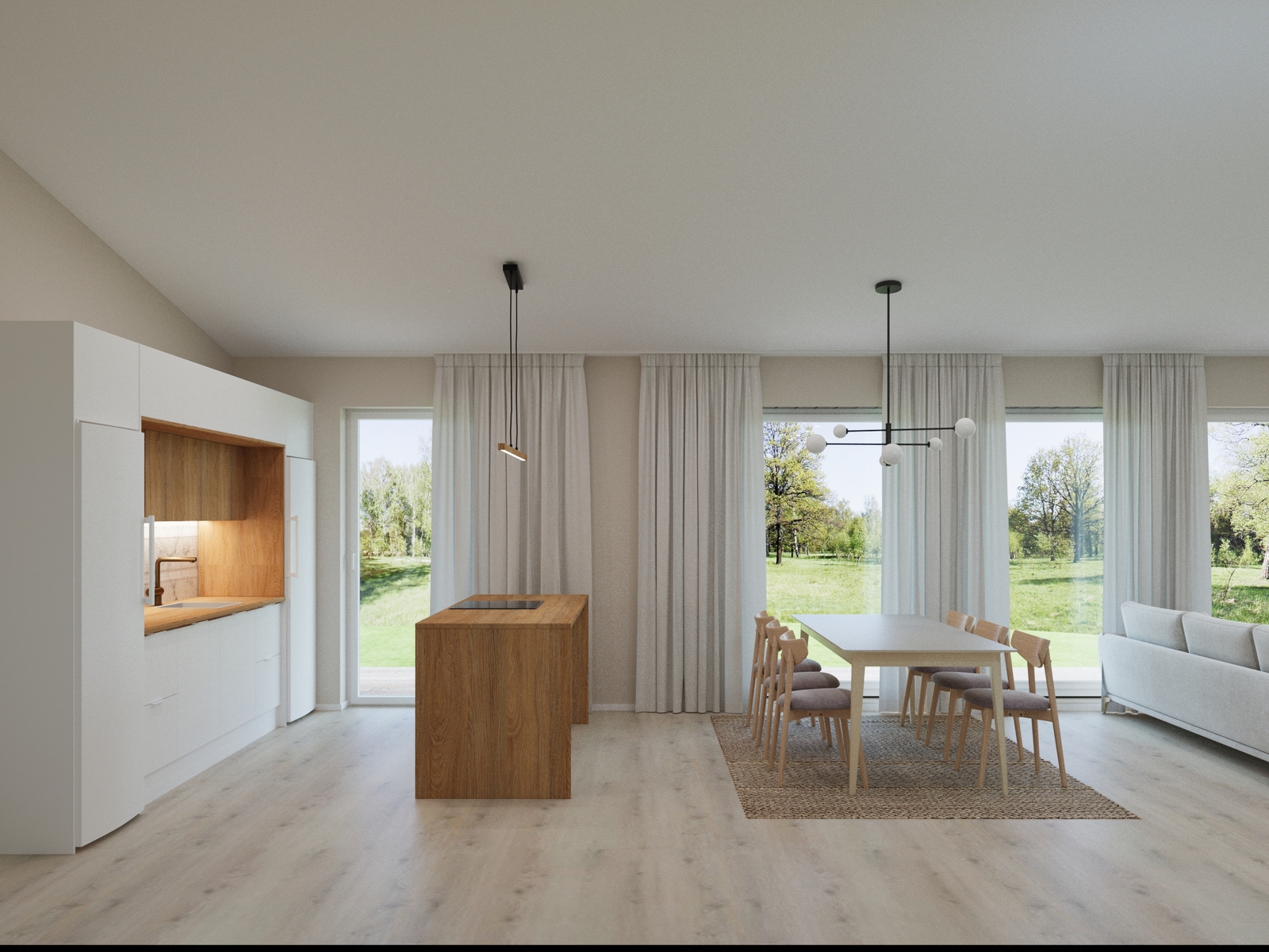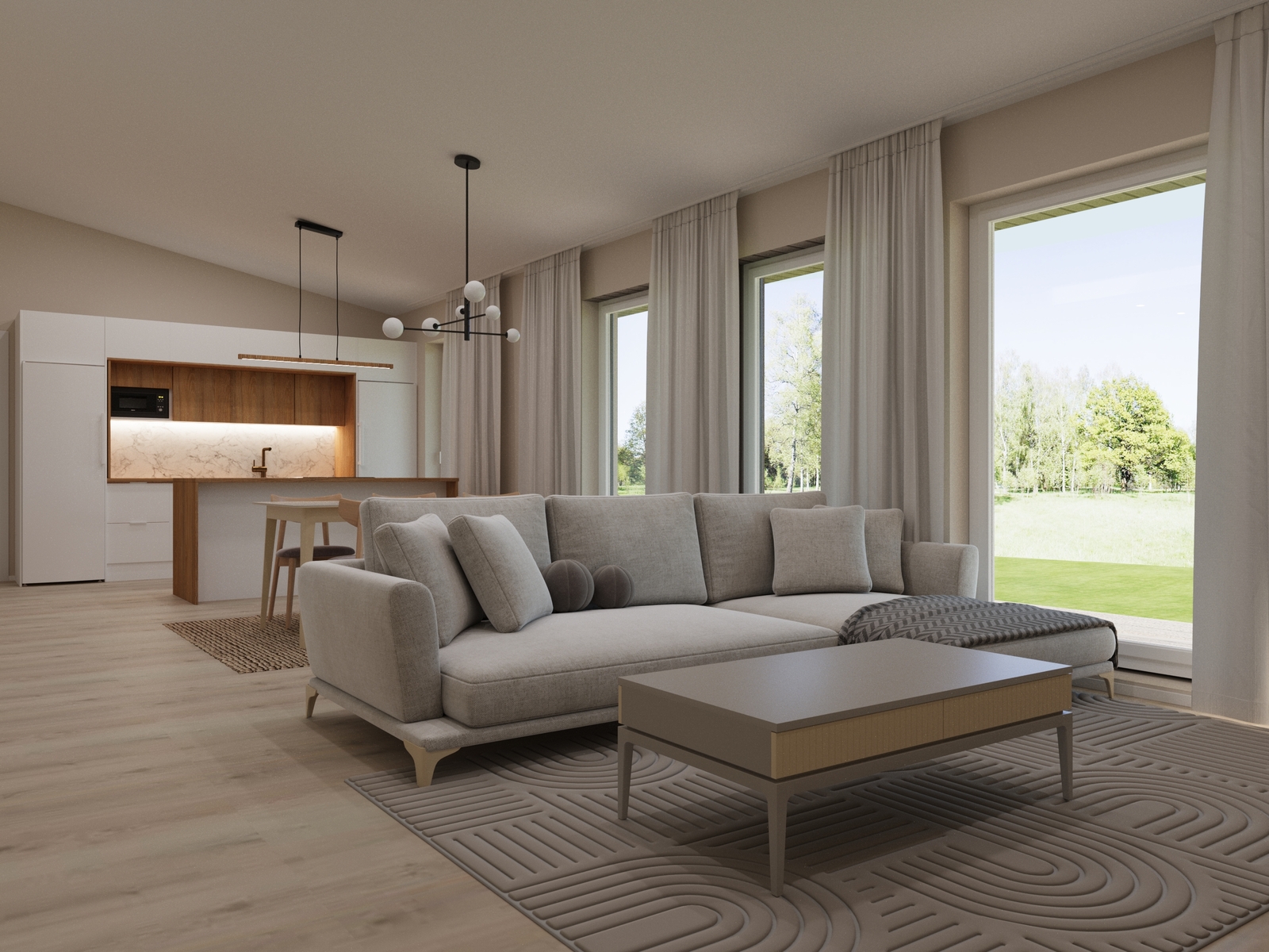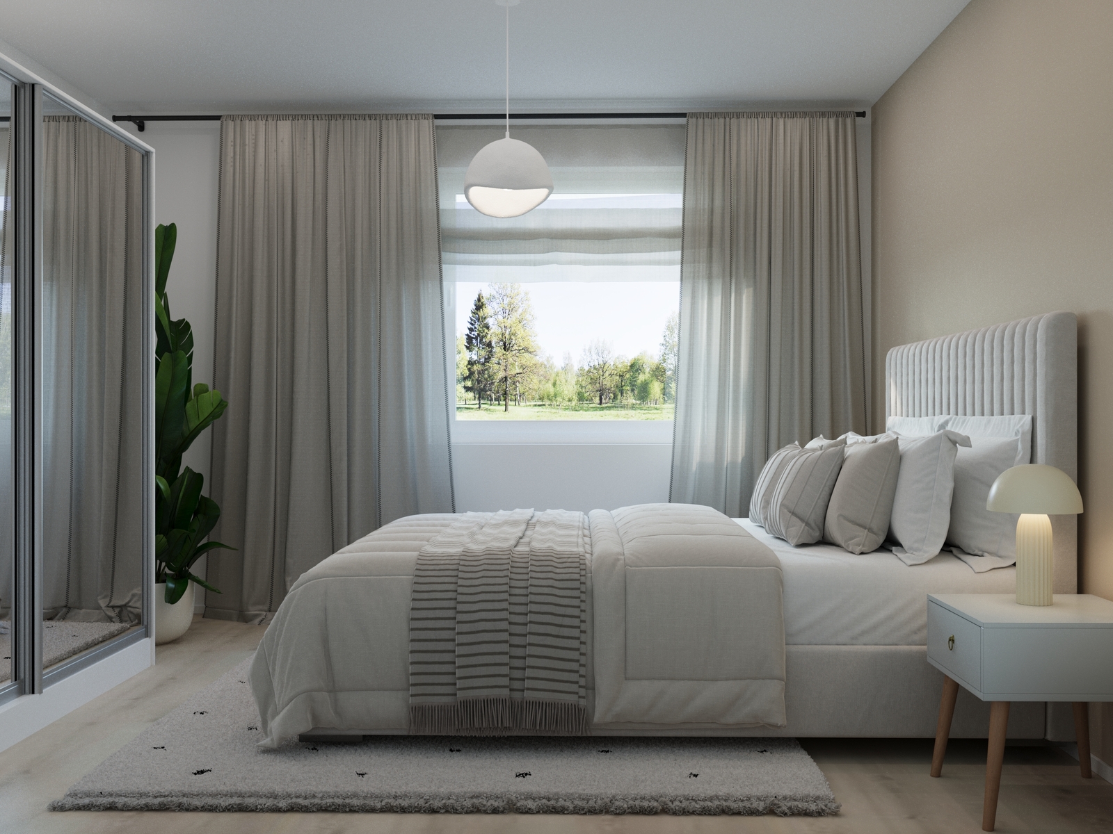 Käytännöllinen pohjaratkaisu, jossa neliöt on käytetty tehokkaasti arjen toimintoihin panostaen. Väljä eteinen kaapistoineen, jonka yhteydessä wc sekä arkieteinen ulkovaatteiden säilytykseen. Sisäänkäynnin jälkeen avautuu tilava keittiö-olohuonetila korotetulla sisäkatolla. Moderni saarekkeellinen keittiö Omega-keittiön kalusteilla. Päämakuuhuone erillään kolmesta pienemmästä huoneesta. Kodinhoitohuone, kylpyhuone ja sauna talon päädyssä, josta suora kulku autokatokseen ja terassialueelle.
