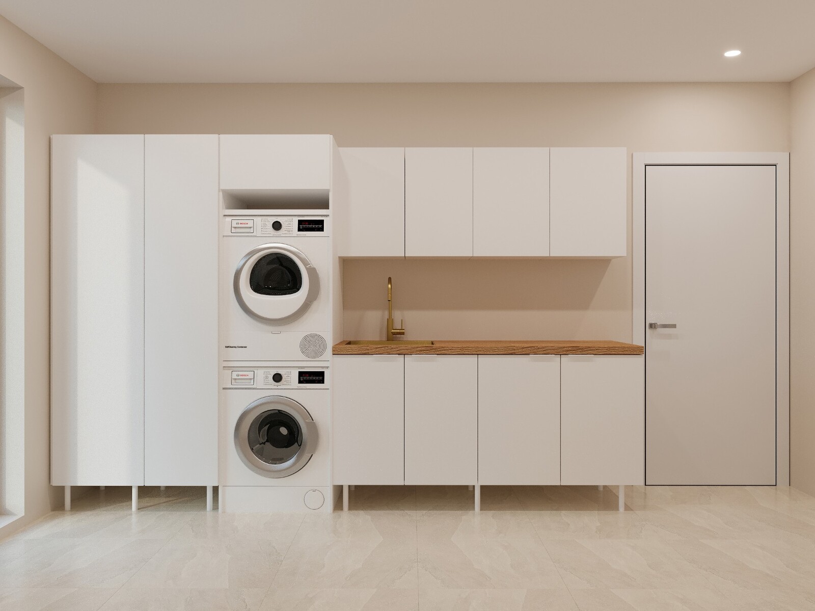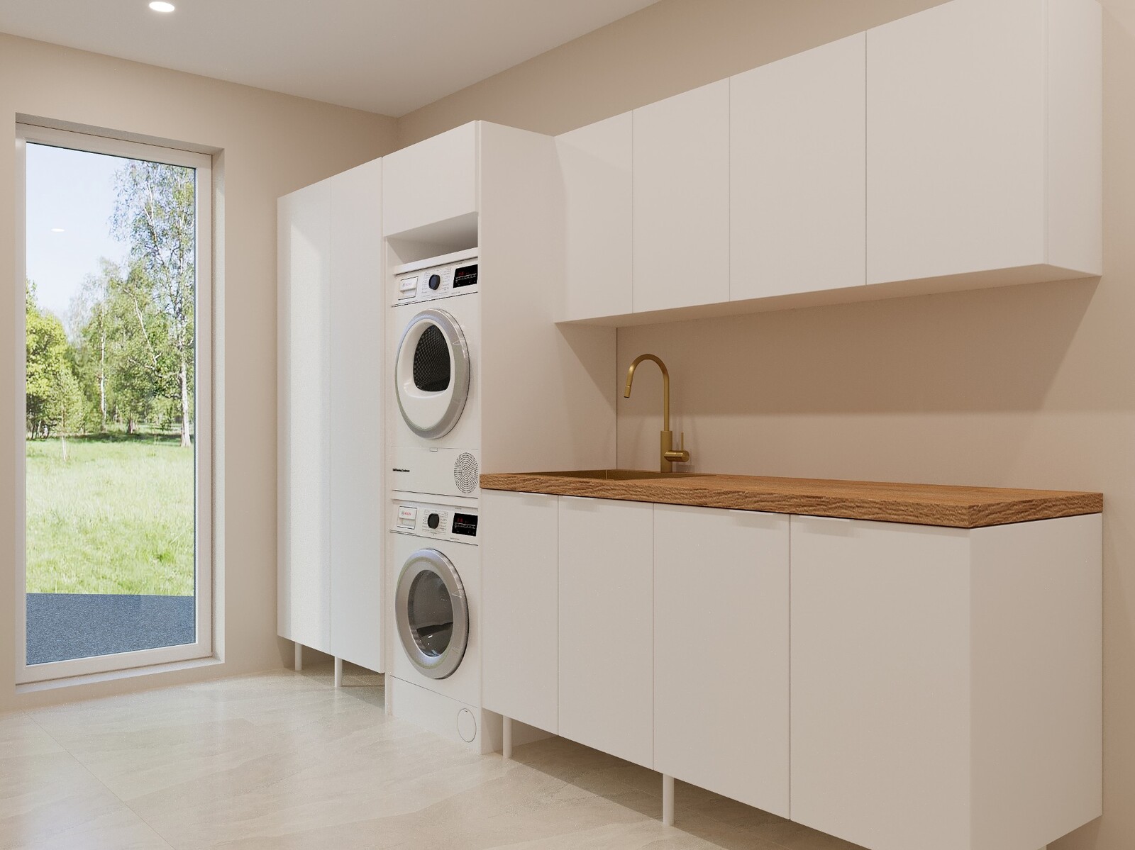 | Kodinhoitohuoneen kuvaus | Pesuallas, pesukoneliitäntä, lattiakaivo, pöytätaso, lattialämmitys ja pyykkikaapit, lattiat (laatta), seinät (maali) |