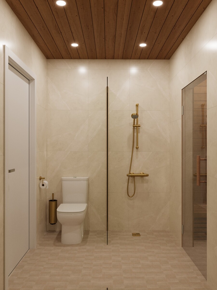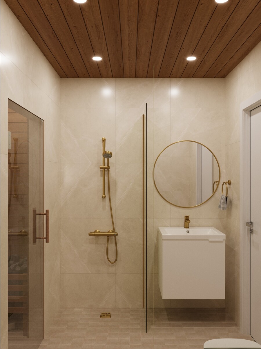 | Kylpyhuoneen kuvaus | Suihkuseinä, peili, lattialämmitys, wc-istuin, suihku ja kiinteät valaisimet, seinät (kaakeli), lattiat (laatta) |