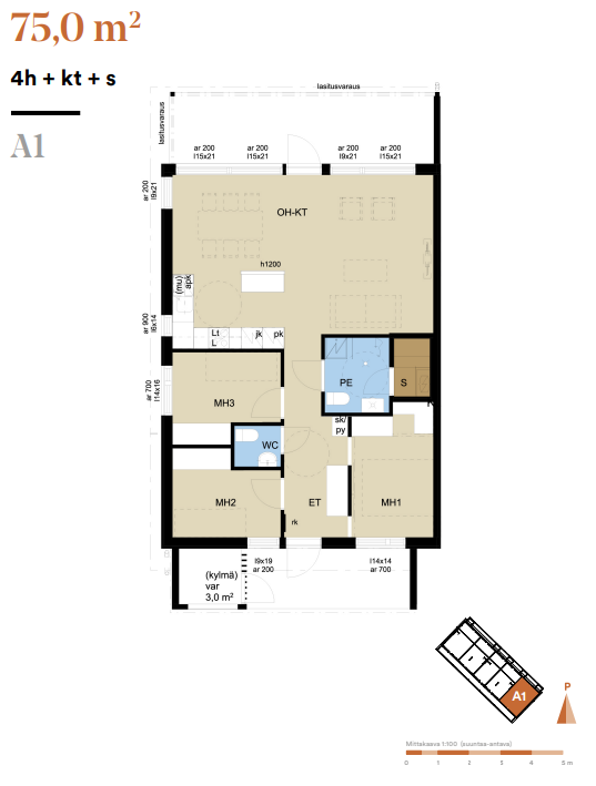 | Huoneistoselitelmä | 4H+KT+S (päätyasunto) |
