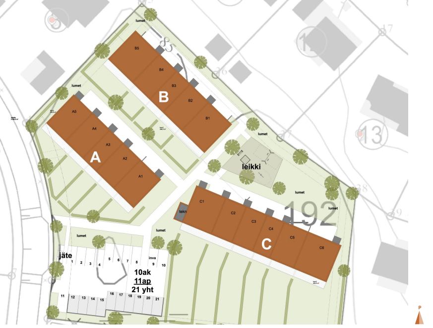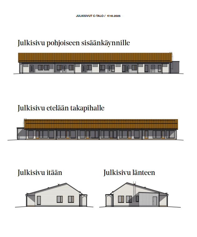 | Pääasiallinen rakennusmateriaali | Alapohja on lämpöeristetty maanvarainen teräsbetonilaatta. Yläpohjat tehdään puurakenteisina. Yläpohjan lämmöneristemateriaalina on puhallusvilla.. Ulkoseinät paneeliverhottuja puuelementtejä. |
