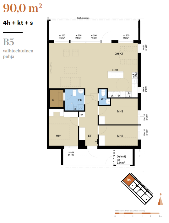 | Huoneistoselitelmä | 4-5H+KT+S (päätyasunto) |
