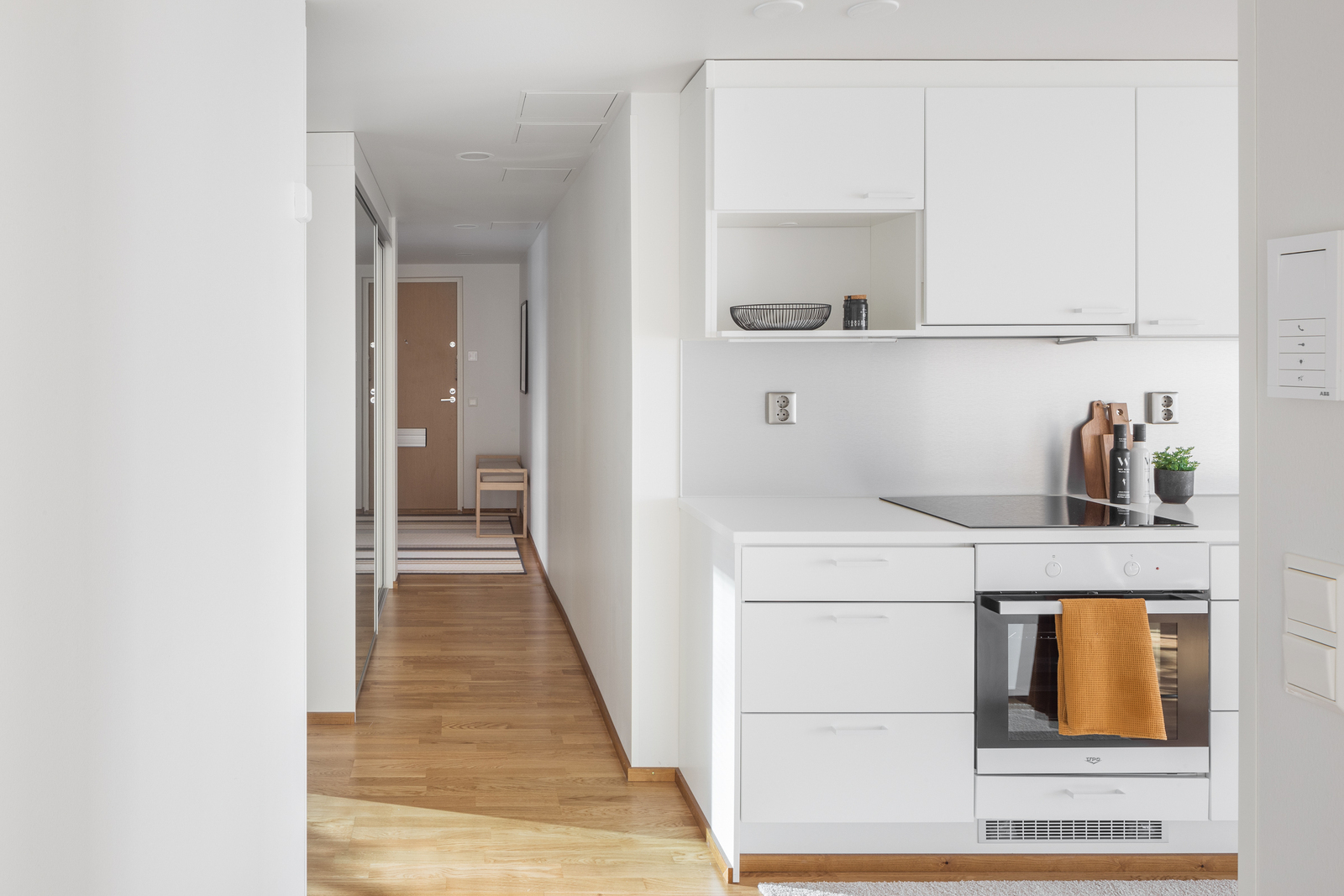 Liesi (Induktioliesi), työtasot (laminaatti), seinät (maali), lattiat (parketti), liesituuletin, liesi ja jääkaappipakastin |