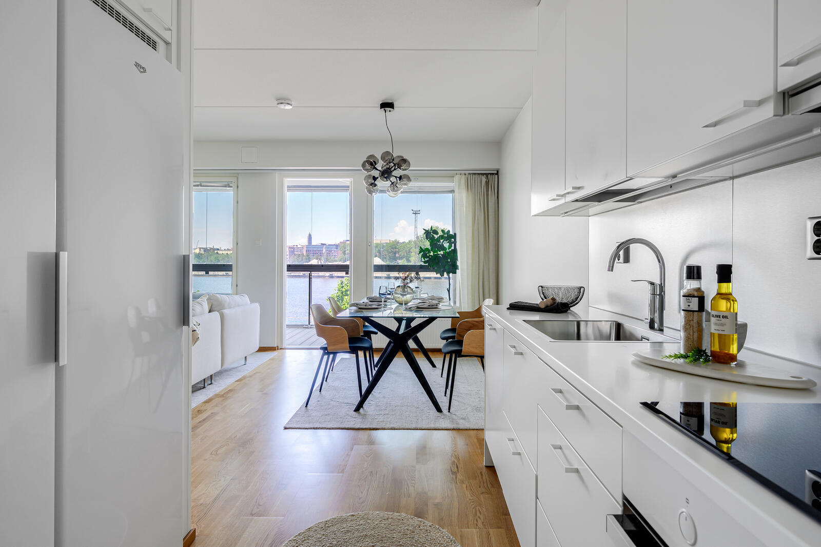 Omalla tontilla toisen kerroksen valoisa koti josta on suorat merinäkymät. Omaa asuntoa on mahdollisuus tarjota vaihdossa. Rakennusvuosi on 2021. Avokeittiö ja ruokailutila yhdistyvät olohuoneeseen josta on käynti tilavalle lasitetulle parvekkeelle. Tässä asunnossa on kaksi vaatehuonetta ja runsaasti säilytystilaa.