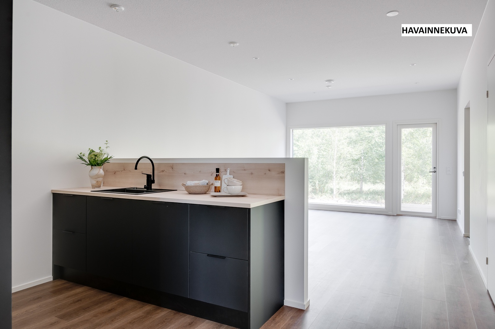 Talossa on kolme makuuhuonetta, avokeittiö ja olohuone, jotka luovat avaran ja valoisan kokonaisuuden.