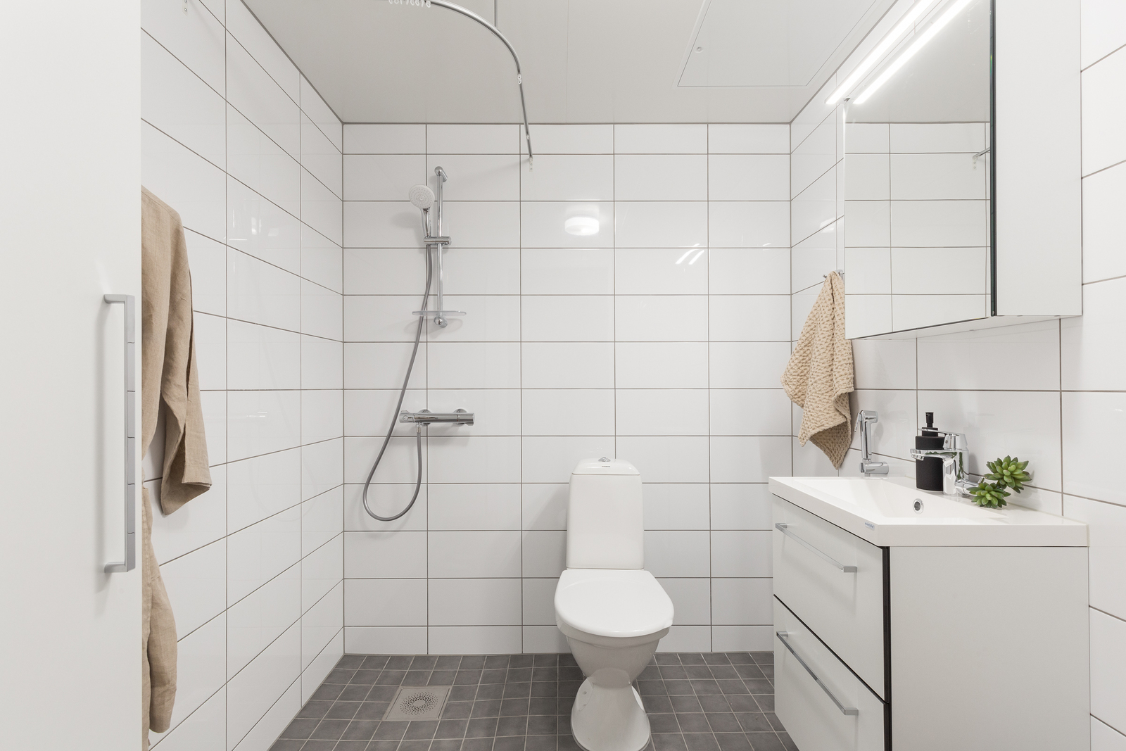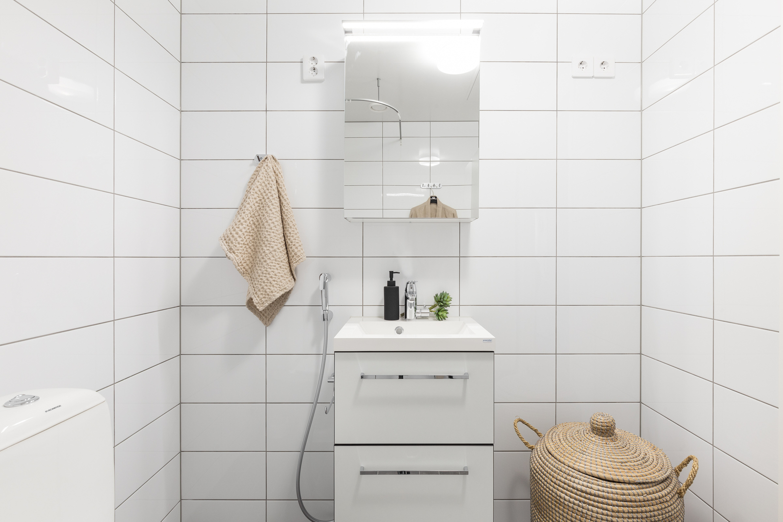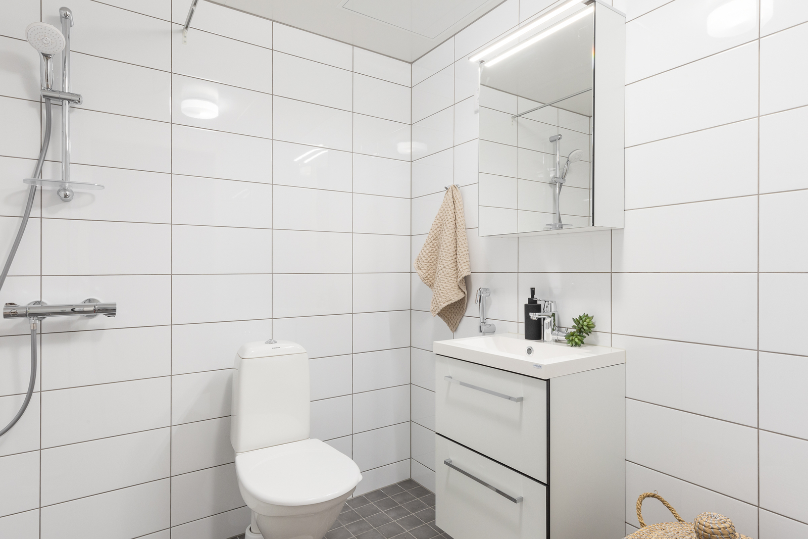 Makuuhuone on rauhallinen ja hyvin mitoitettu, ja se tarjoaa runsaasti säilytystilaa. Tyylikäs kylpyhuone on tilava ja varustettu nykyaikaisilla ratkaisuilla.