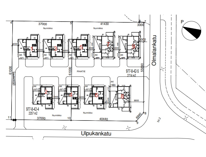 Kuusi erillistaloa: 2 mh, avok, oh, erill. wc, wc/kh/khh, sauna, asuintilat 67 m² + terassi, autokatos ja 5,2 m²:n varasto.