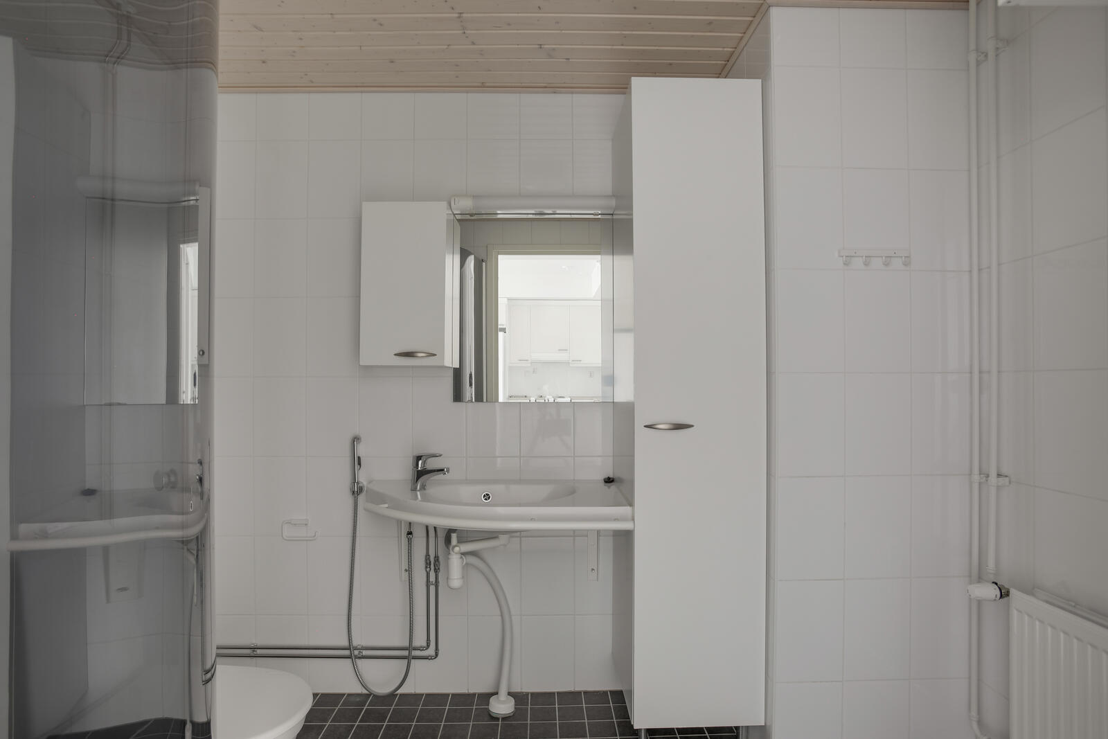 | Kylpyhuoneen kuvaus | WC-istuin, suihku, suihkuseinä, pesukoneliitäntä, lattialämmitys ja peili, seinät (kaakeli), lattiat (laatta) |