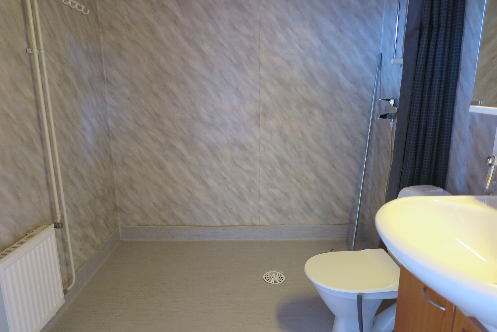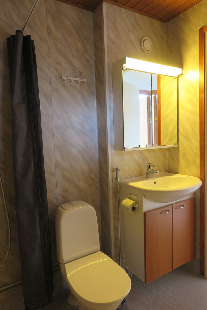 | Kylpyhuoneen kuvaus | Lattialämmitys, pesukoneliitäntä, suihku, peili, wc-istuin ja kiinteät valaisimet, seinät (muovimatto), lattiat (muovimatto) |