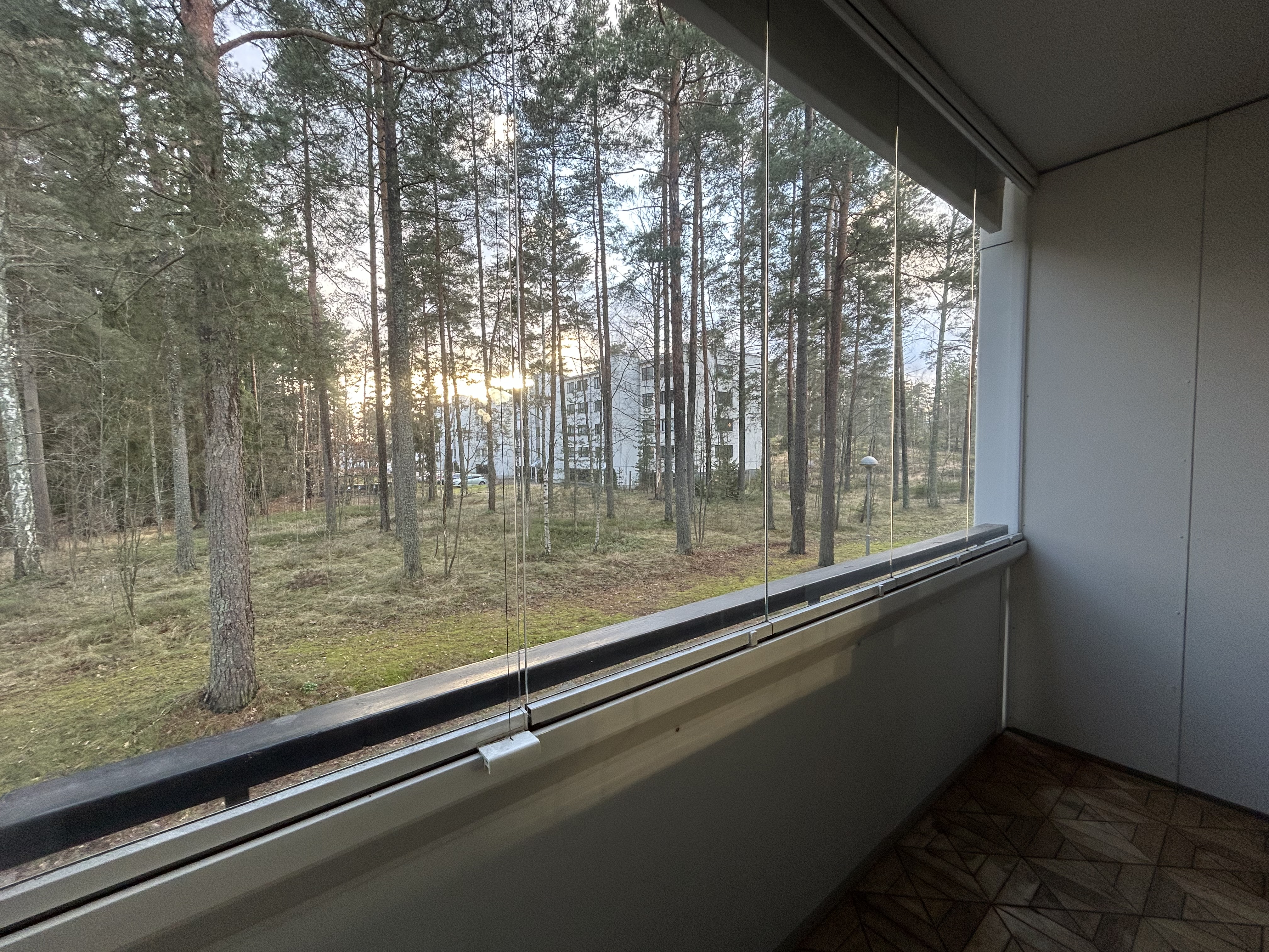 Lasitettu parveke avautuu kaakkoon metsäiseen näkymään, ei ikkunanaapureita. Yhtiössä on lisäksi tehty mm putkiremontti, asumishaittoja ei ole näköpiirissä.