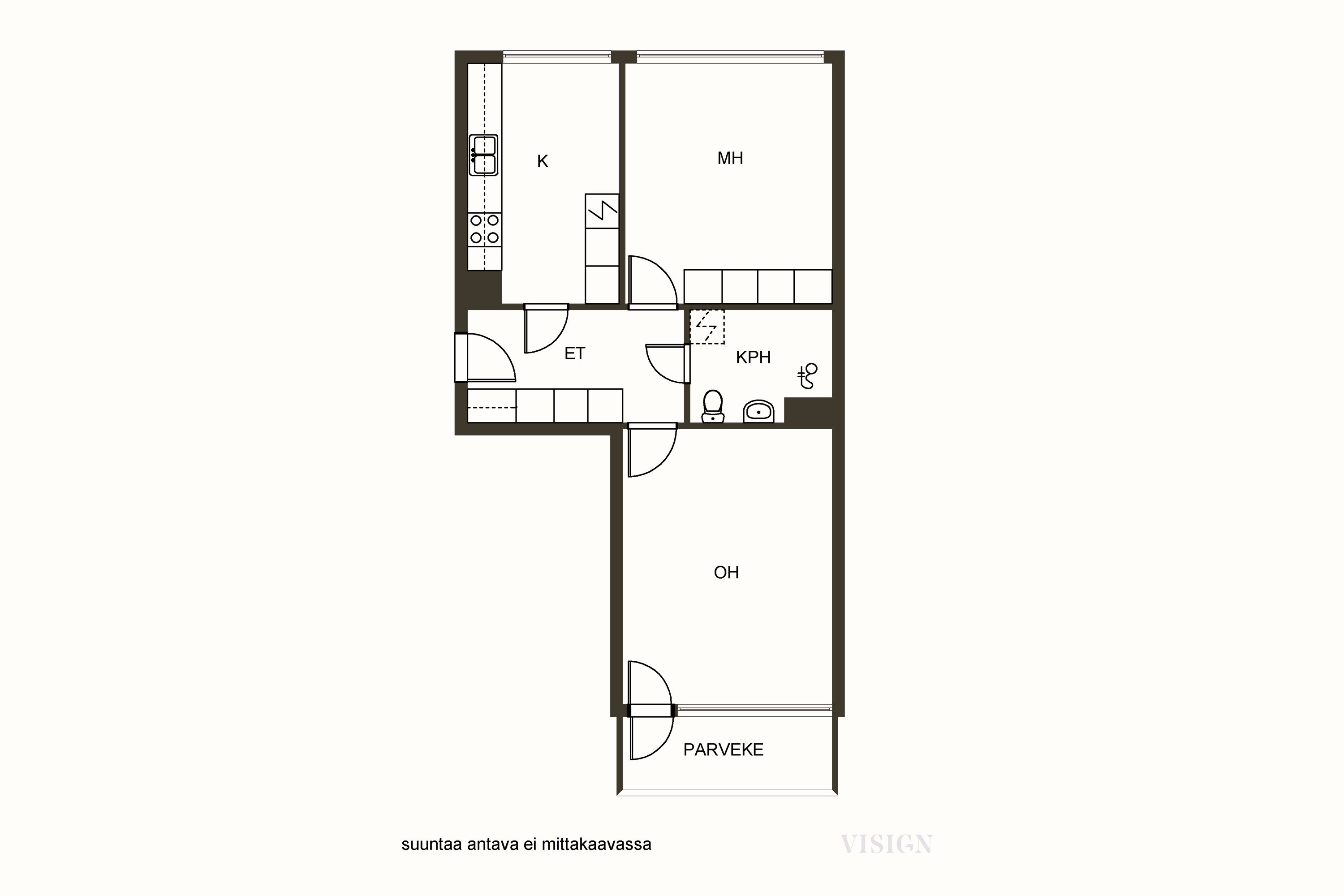 Asunnossa on toimiva pohjaratkaisu erillisellä keittiöllä, mikä lisää tilan tuntua ja tekee kodista erinomaisen vaihtoehdon myös kimppa-asumiseen. Makuuhuoneessa on runsaasti kaappitilaa, ja siistissä kylpyhuoneessa on paikka sekä liitännät pyykinpesukoneelle.