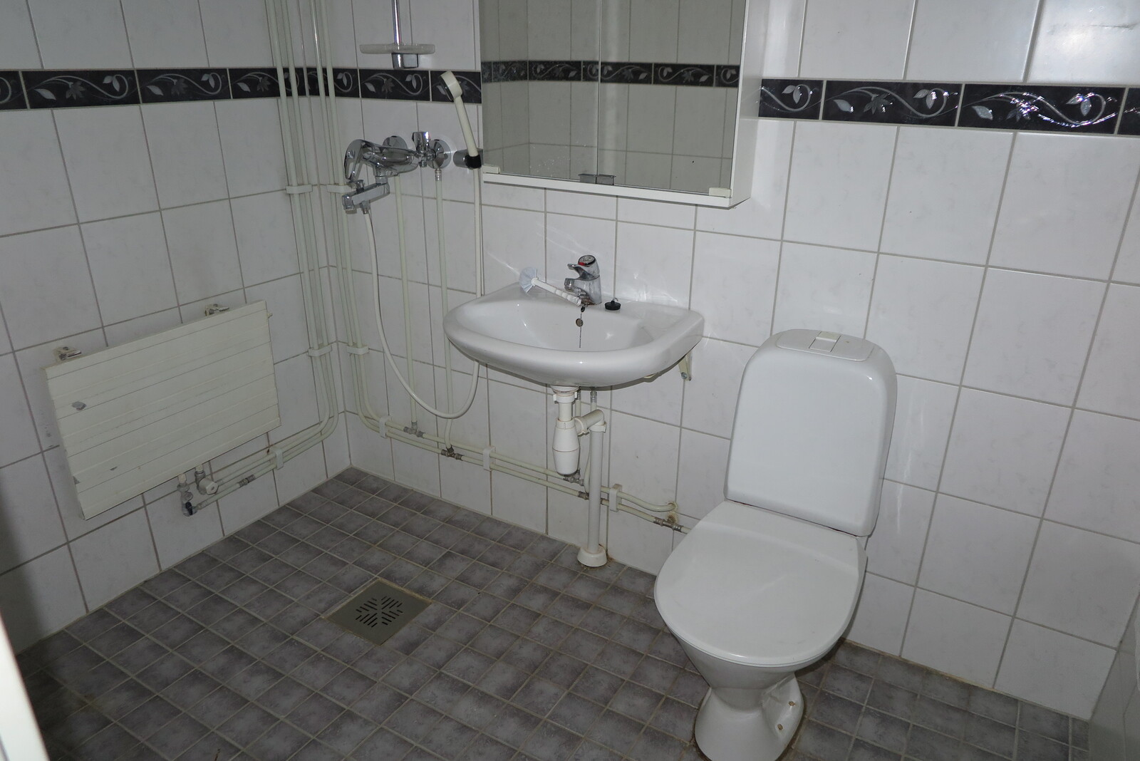 | Kylpyhuoneen kuvaus | WC-istuin, pesukoneliitäntä, peilikaappi ja suihku |