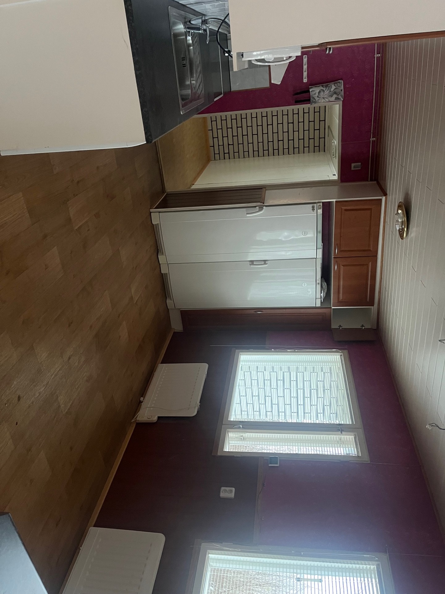 Liesi (Keraaminen liesi), työtasot (laminaatti), seinät (maali ja puolipaneeli), lattiat (muovimatto), jääkaappi, erillinen pakastin, liesi, astianpesukone, liesituuletin ja mikroaaltouuni |