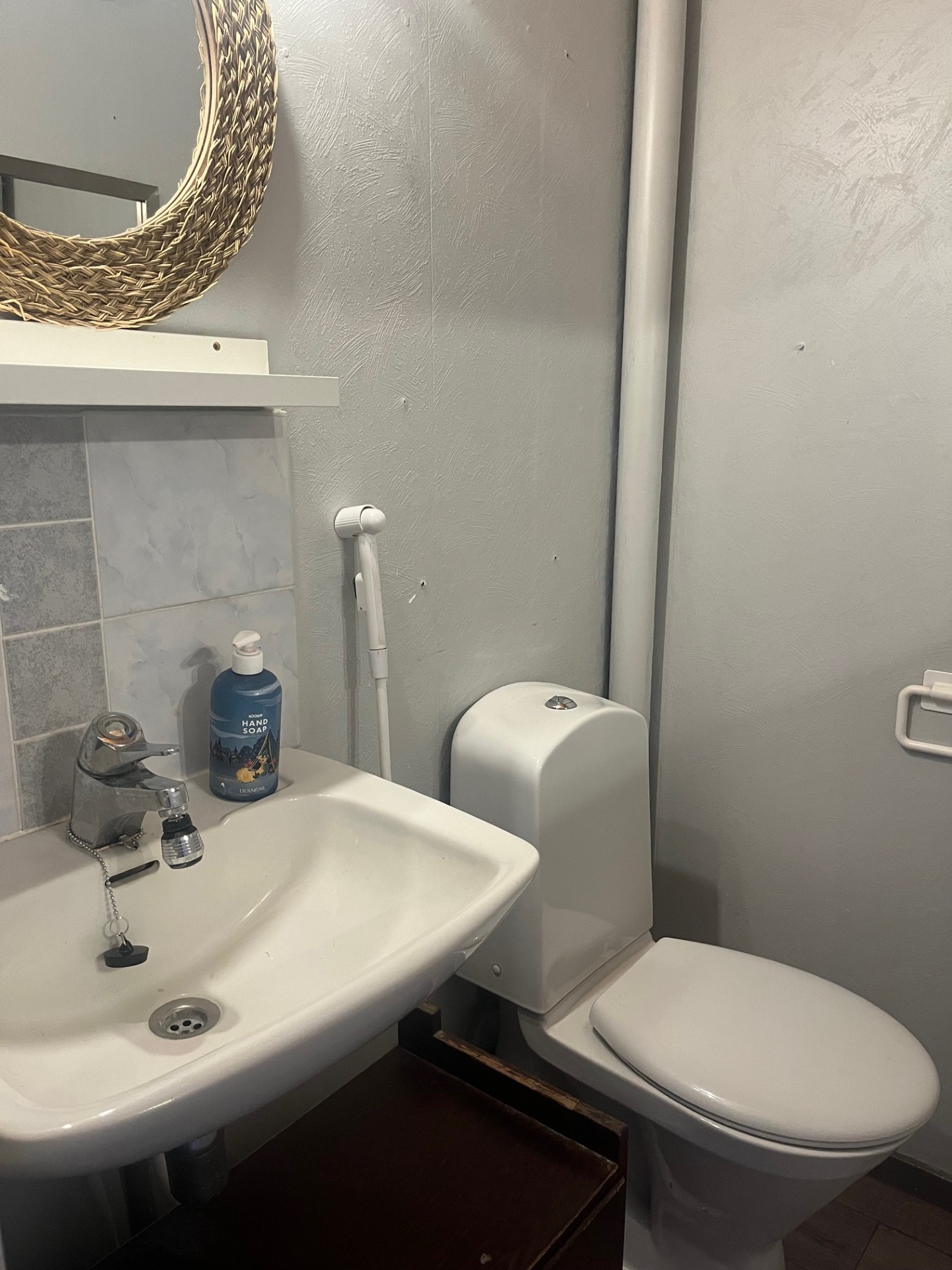 WC-istuin, peili ja pesuallas, seinät (Maali), lattiat (Muovimatto) |