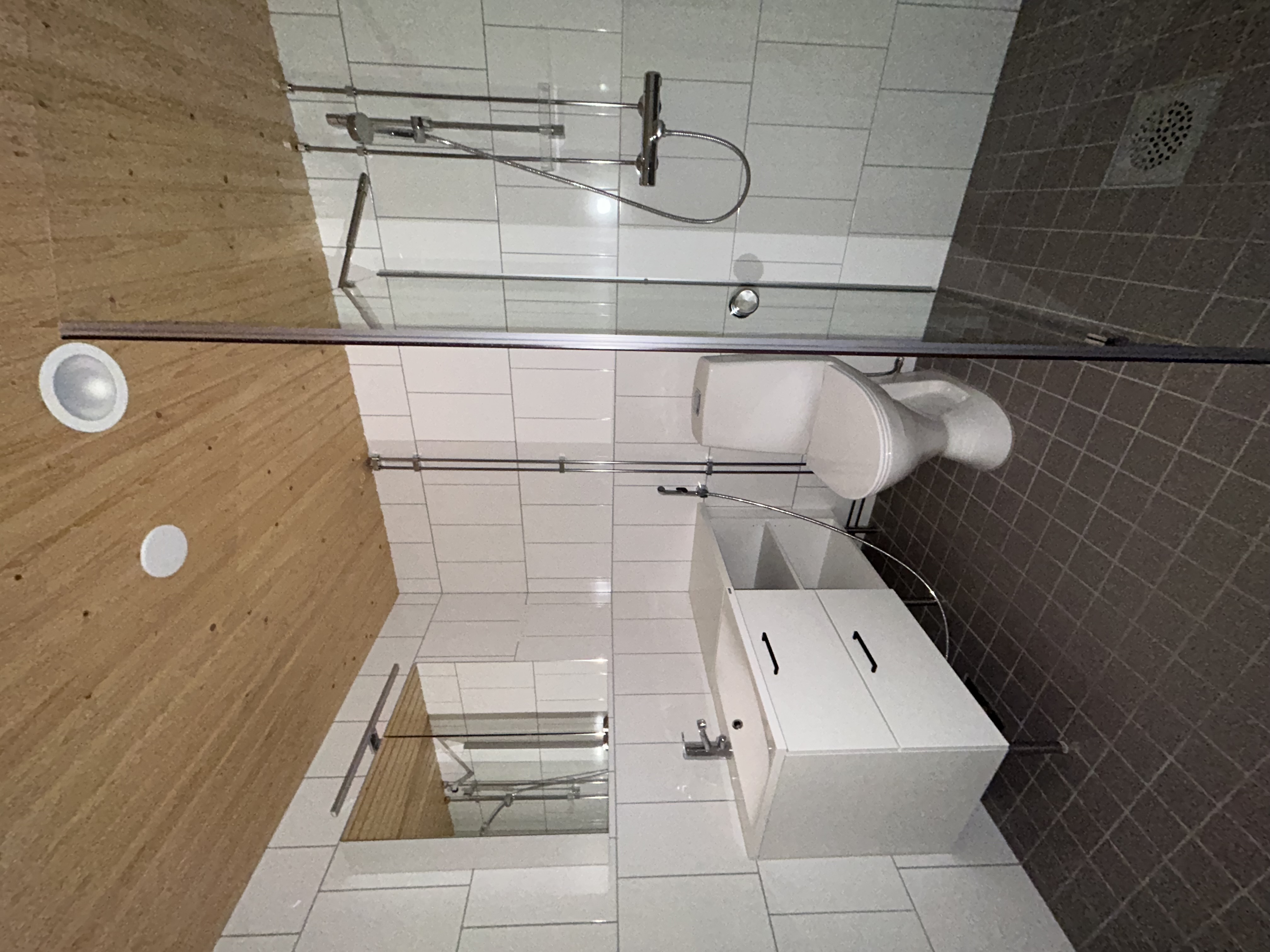 Kylpyhuoneen kuvaus WC-istuin, suihku, pesukoneliitäntä, peilikaappi ja bidee-suihku, seinät (kaakeli), lattiat (laatta)